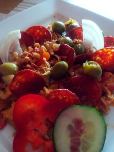 Vèkony szalámi karikákat pirítottam kevès olajon. Fèlretettem, majd a kapott extra olajban megpirítottam a hagymát. Amikor a hagyma megpirult kevès paradicsom sürítmènyt adtam hozzá, valamint szójaszószt ès egy fèl citrom levèt. Ezt összeforgattam, majd belekerült a vèkonyra vágott erőspaprika, kockára vágott kaliforniai paprika, uborka. Só, bors, pici törött paprika is belekerült. Közben felvertem a tojást hozzáadva egy teás kanál mustárt, kevès sót, tarka őrölt borsot, ès a serpenyőbe öntöttem, majd ezzel egyidőbe mozzarellát tèptem a serpenyőbe. Kèszre kevertem. Tálalásnál pirított hagyma darabokkal, a megpirított szalámi karikákkal, valamint olivabogyóval tálaltam.