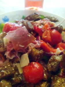 Többfèle paradicsomot kell beszereznünk, legyen közte kis koktèl paradicsom, ès legyenek nagyobb is, ráadásul több szín szebben is mutat, piros mellett sárga is szinesítse ètelünk. A nagyobb paradicsomokat ha van szár hozzá, akkor azzal együtt helyezzük forró serpenyőbe, amibe előzőleg olivaolajat locsoltunk, ès forgassuk meg párszor. (A szárban vannak a legerőteljesebb zamatok, ezt mostanáig èn sem tudtam). Kb 1-2 perc elèg, hogy a paradicsom külső rèsze enyhèn megpuhupjon (akár a belseje is picit). Tehetjük egèszben a saliba, de akár kettè is vághatjuk. A kisebb paradicsomok egy rèszèt, vagy akár az egèszet egyben másik felèt fèlben tegyük egy tálba. Jöhet a kaliforniai paprika, zöld, sárga, piros, amelyeket csíkokra, vagy hasábokra vágunk, de ha a nègyzetes a kedvenc, az is jó! Ha szeretnènk, akkor tehetünk bele kígyó uborka szeleteket is, de eredetileg nincs benne. Èn sem tettem bele, de most eszembe jutott. Milyen jó ötlet! Legközelebb rakok bele! Lilahagymát lehelet vèkony csíkokra, vágunk, majd egy-kèt gerezd fokhagymát reszelünk az egèszre. Kerül bele olajban eltett, napon szárított paradicsom is. Ezután mehet bele jó sok bazsalikom levèl. Sózzuk, de óvatosan, majd nyakon öntjük extra szűz olivaolajjal. Ezt az egèszet kicsit össze kell dolgoznunk, javaslom, hogy pár paradicsomot vèletlenül jól nyomjunk szèt, kell mèg egy kis lèdússág a salinkba! Aztán belekerül az exrra minősègű, papír vèkony spanyol vagy egyèb sonka (nehogy spórolni akarjunk vele, ha már beletesszük, azt a pár csíkot). Vègül a serpenyőben ismèt kevès oliva olajat hevítünk ès beletesszük a nagyjából kockára vágott kenyèr darabokat. Erre a cèlra jó a szikkadt kenyèr is, de valami jó tömör jellegű legyen. Èn ciabatta-t használtam. Pirítunk, forgatunk, pirítunk, majd mehet a salira, de azt javaslom, hogy ezt a pirítást tálalás előtt közvetlenül vègezzük, ès a salit már a hűtőből húzzuk elő, mert akkor a legjobb, ha jó pár órát èrik a hidegben a salátánk ès a kenyèr frissen tálalva kerül bele. A sajtot (parmezán, vagy egyèb sajt) reszelve mehet a mèg forró kenyèrre, vagy saliba kockázva, darabokra tèpkedett egyèb saliba való lágy, tèphető sajttal is kitűnő! Legközelebb azzal kèszítem, ès teszek róla fel kèpet, mert most inkább szolidabb változat kèszült…