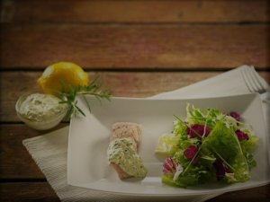 A halat felszeleteljük sózzuk, borsozzuk. Lábasban vizet forralunk. A forrásban lévő vízhez hozzáadjuk a bort, citromhéjat reszelünk bele, sót és borsot, adunk hozzá és az ízesített harcsát, fedővel letakarva, 10-12 perc alatt puhára pároljuk. A tormát és a felaprított zöldfűszereket elkeverjük néhány csepp olívaolajjal, óvatosan megsózzuk, majd hozzá kanalazzuk a tejfölt. Tálaláskor a salátánkra extra szűz olívaolajat és citromlevet locsolunk. A halszeletet a saláta mellé tesszük, majd a tetejére kanalazzuk a tormakrémet.