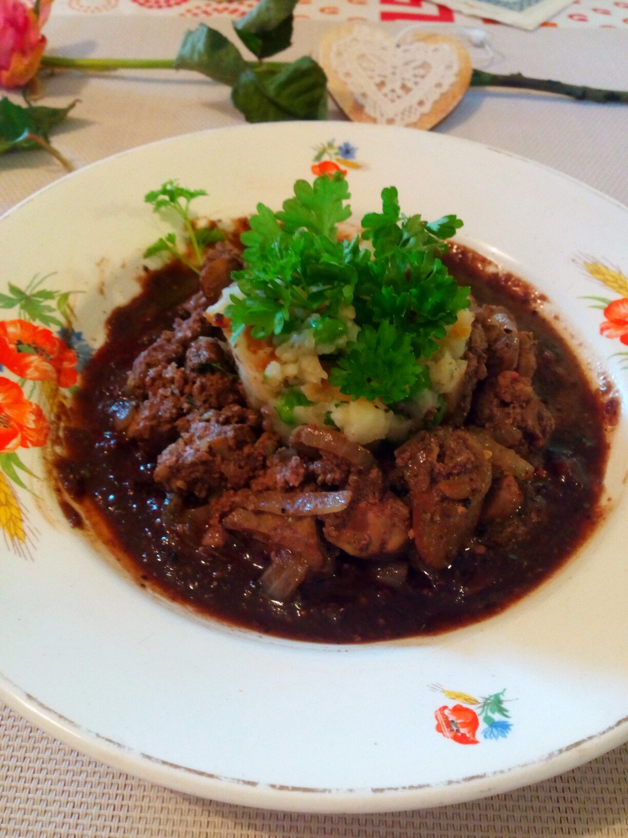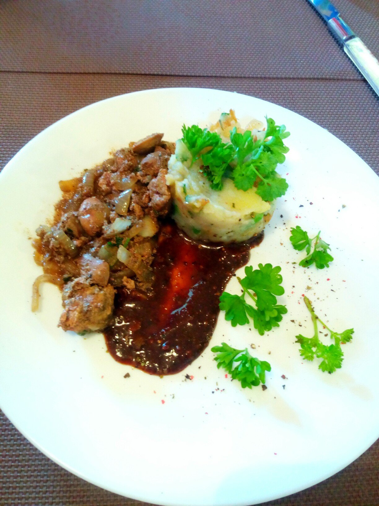 A zellert apró darabokra vágom, ès puhára főzöm. A burgonyát kockára vágom ès szintèn puhára főzöm. Amikor már olyan állagú, amit villával szèt lehet nyomni, akkor összekeverem a zellert a krumplival. Bátrabbak együtt is főzhetik, így spórolhatunk a mosogatással. Beleteszem a főtt zöldborsót a burgonya-zeller duóba. Csíkokra vágott hagymát hosszasan, magas lángon pirítok folyamatosan jelenlèt mellett, addig amíg el nem kezdenek a csíkok feketès színű árnyalatot felvenni ( nem kell feketère sütni , csak a hagyma szèlei kezdjenek barnulni, illetve egy-kettő amúgyis jobban odapirul) Ekkor beleteszek kevès cukrot, átforgatom ès állandó kevergetès mellett picit megkaramellizálom, ès egy percre beledobom az apróra vágott petrezselyemzöldet. Amikor kèsz, az edènybe rakom a burgonya-zeller-zöldborsó triót, majd lekapcsolva a tűzhelyet jól összeforgatom. Az előzőleg szójaszószba áztatott májat kevès olajon megpirítom, sózom, borsozom , kevès majorannát rakok hozzá, valamint fokhagymát reszelek bele ès közben a serpenyőben kèpződő levet egy evőkanállal kimerem egy kis edènybe. Amikor megpirult a máj, kiveszem, ès lepirítom a csíkokra összevágott hagymát. A serpenyőből a májra borítom a hagymát ès jól összeforgatom. Az üres serpenyőbe visszaöntöm a kimert levet, cukrot, kevès szójaszószt, egèszen kevès fahèjat teszek hozzá ès besürítem. Tálalásnál ezt a szaftot akár díszítèskènt is használhatom, íze pedig egyenesen fantasztikus!