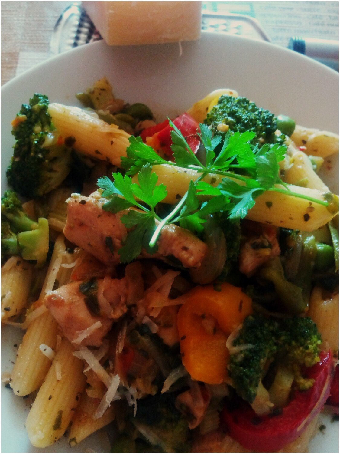 A csirkemell csíkokat szójaszószba áztatom jó pár órára, majd kiveszem a hűtőből, és kb 1 órát hagyom felmelegedni. Ezalatt összevágom a paprikát, paradicsomot felkockázom, répát vékony hasábokra vágom, brokkolit szétbontom, hagymát vékony csíkokra vágok, egy-két gerezd fokhagymát vékonyra szeletelek. Olivaolajat hevítek, majd a csirkemell csíkokat jól megpirítom, hogy aranybarna színt kapjanak, közben sózom, borsozom. Ha jól megpirultak, akkor kiszedem a serpenyőből és helyére a hagymacsíkokat rakom, majd ezt is jól megpirítom. Közben vízforralóba vizet forralok, és a brokkolit leöntöm, és letakarom, így gyakorlatilag ehetővé puhul. Ha a hagyma is megpirult, akkor ezt is kiveszem. Közben vizet forralok a tésztának, és készre főzöm, de a főzőlevet nem öntöm le, hiszen még szükségem lesz rá. A serpenyőben, összepirítom a zöldborsót, répát, paprikát, paradicsomot, és kevés paradicsomlevet öntök bele, ezzel forgatom össze magas lánggal, és hozzáadom a fűszereket: szárított medvehagyma, friss petrezselyem, bazsalikom, vegeta, bors, egy leveskocka (zöldség, vagy csirkehúsleves), kevés darált chili. Visszahelyezem a húst, és nagyon kevés vízzel felöntöm. Addig főzöm, amíg a paprika, répa még egy picit ropog, a hús pedig készre fől, a legvégén pedig hozzákeverem a brokkolit. Az egészet kiteszem egy edénybe, de úgy, hogy szűrő segítségével kinyerem a maradék levet, amit visszaöntök a serpenyőbe, hozzámerek a tészta főzőlevéből, kevés szójaszószt adok hozzá majd elkezdem magas tüzön besűríteni. Adhatunk hozzá egy kis vajat is, hogy krémesebb legyen. Dönthetünk úgy, hogy az egészet összekeverjük a zöldséges hússal, tésztával, de tálalásnál is leönthetjük ezzel a szósszal. Én az egészet rögtön összeöntöttem, jól összeforgattam, így egy igazán szaftos, színes, ízletes ételt kaptam.