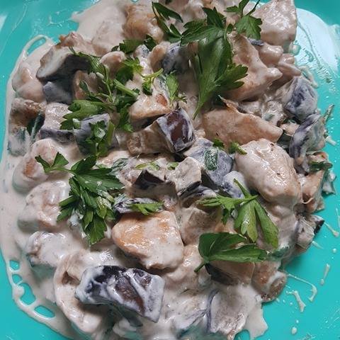 Hozzávalók: 0.5kg csirkemell filé, 3db újhagyma, 1-2db padlizsán, 1 doboz görög joghurt, petrezselyemzöld, só, bors